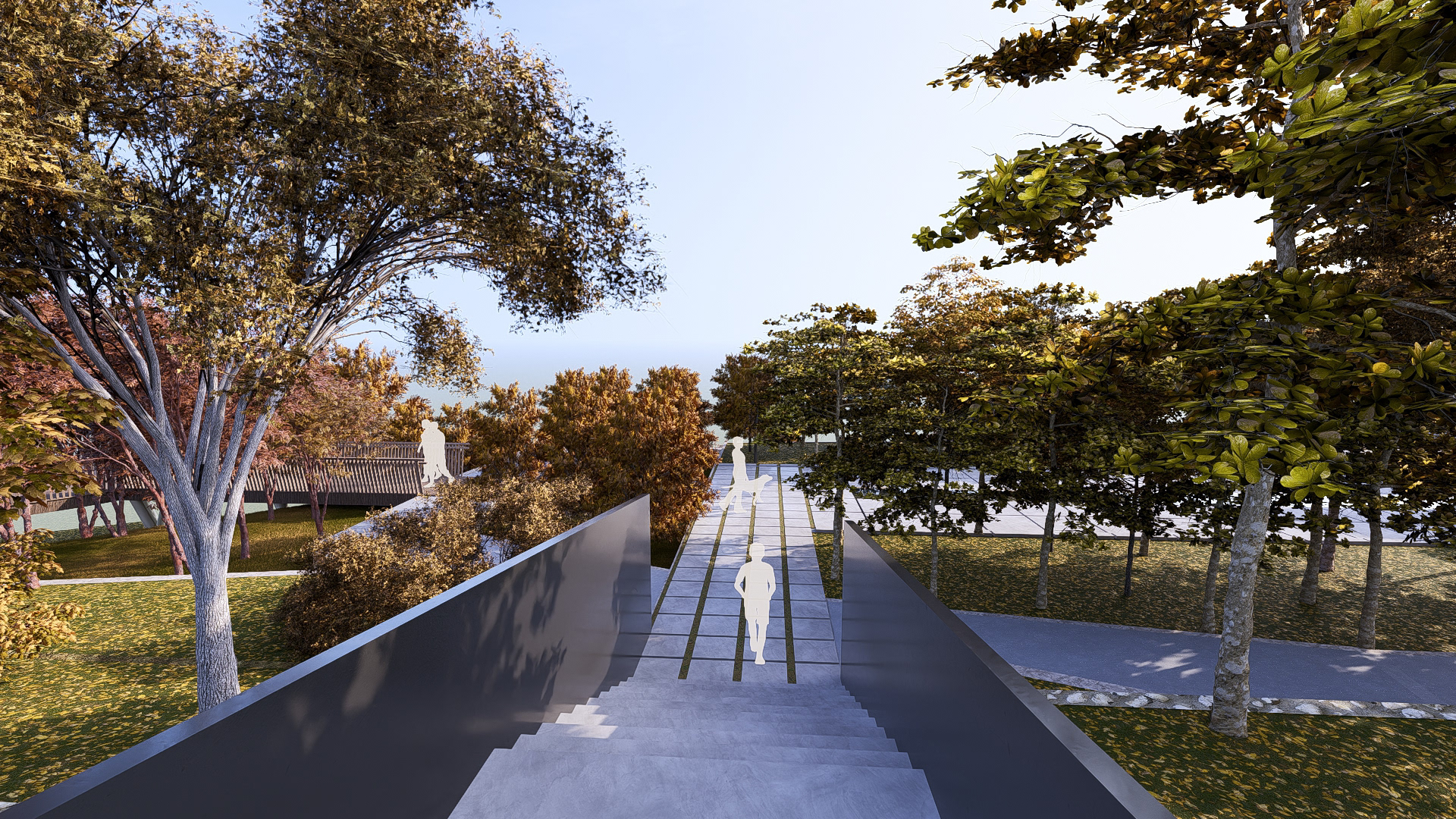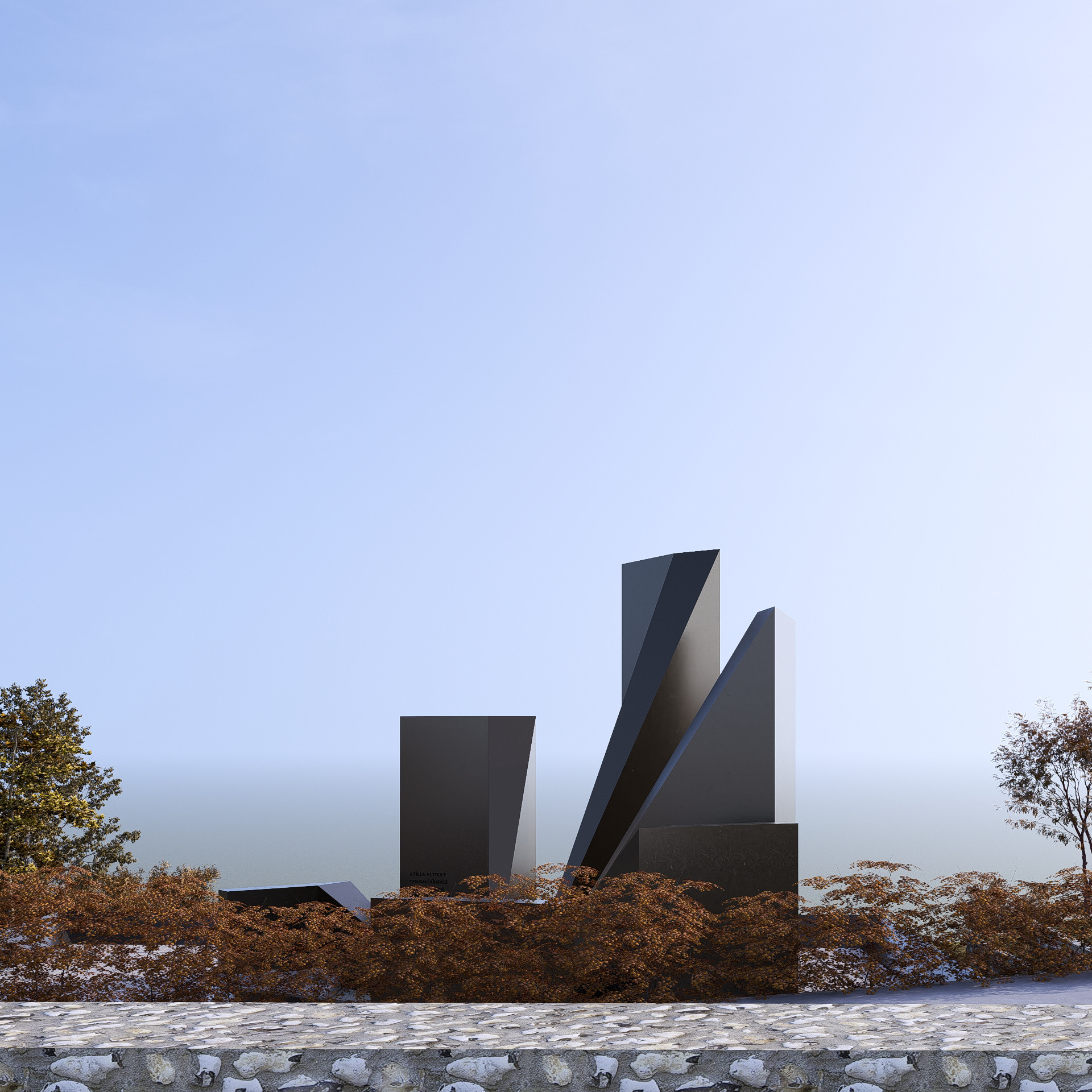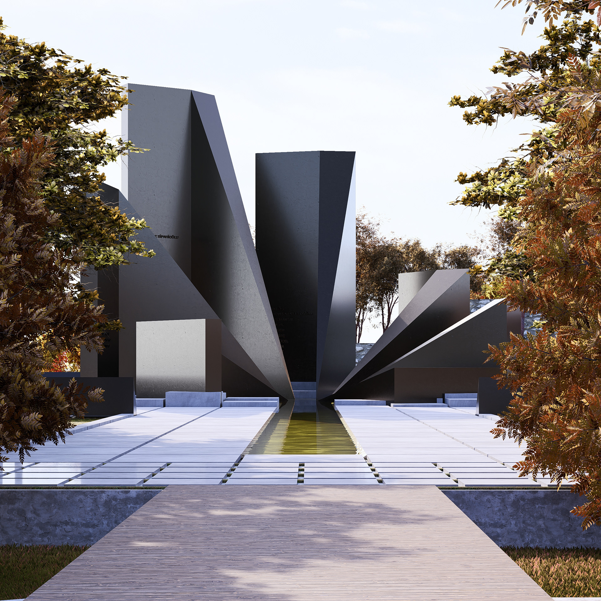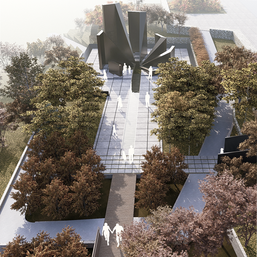 The pathway leading to the monument is lined with almond trees whose seasonal changes create different atmospheres throughout the year, offering visitors a sense of calm, remembrance, and focus on the monument. The dynamic form of the monument provides shifting perspectives as one approaches, establishing an interaction between landscape and monument that evolves with time and distance. The height of each slab, designed to represent its respective continent, corresponds to the number of diplomats martyred there. These slabs take the form of steles, each inscribed with names and complemented by openings symbolizing the lives lived. The steles, as reminders carrying the memory of the fallen, elevate each slab and link the central peace point with their sacrifice. Thus, each continent is embodied as a history dedicated to peace and a path traced by the diplomats who gave their lives.