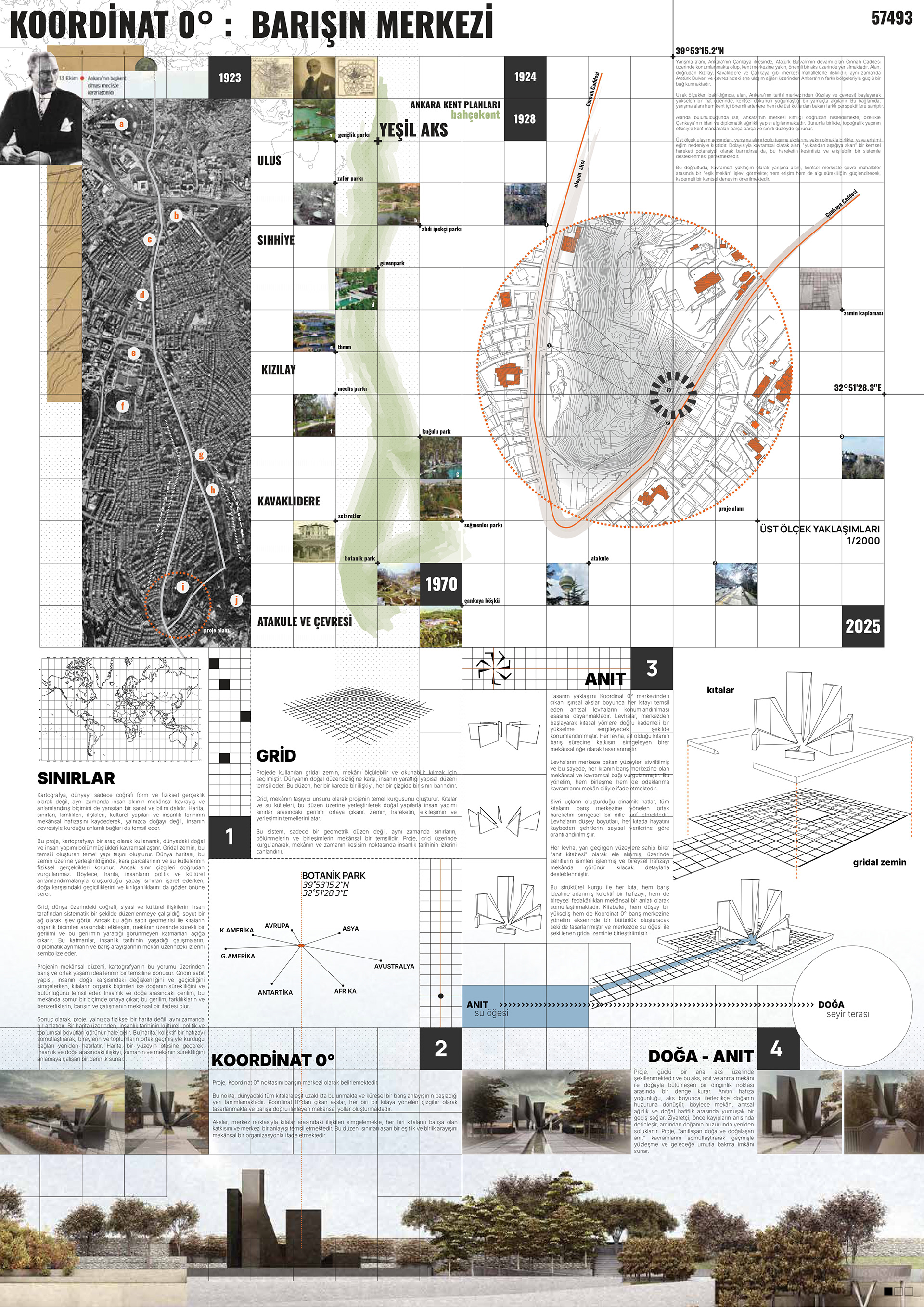 At the time Ankara was declared the capital of the Republic of Turkey, it was still a small town. The vineyards, gardens, and farmlands surrounding the city created a natural green belt. This belt defined the city’s physical boundaries and shaped a traditional garden-city character. Respecting this natural heritage, the monument is located within the Botanical Park, carefully integrated into the existing contours. In this way, it functions both as a “memorial balcony” facing the city and as a “pathway” opening into nature. As the visitor moves along the grid surface, they experience a constant transition and tension between nature and the monument.