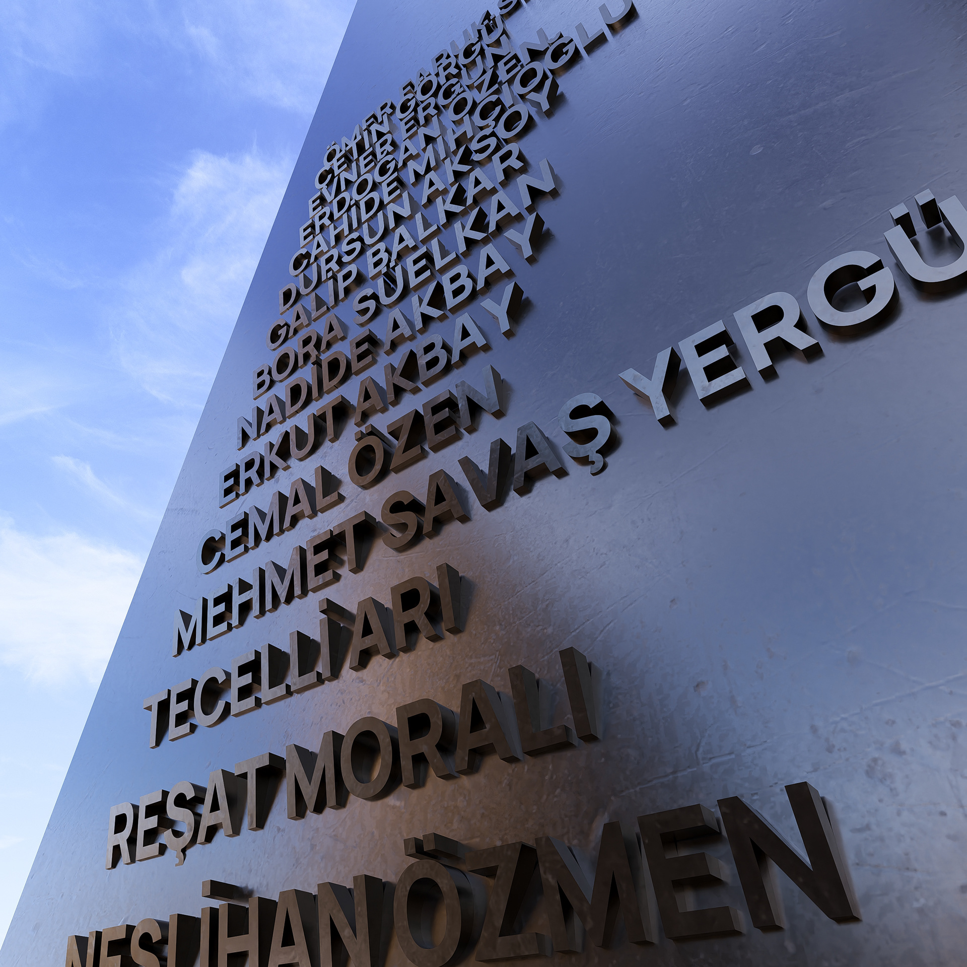 The monument site is laid out on a gridded ground encompassing the whole world. This order, at times interrupted or overlapping, emphasizes the ideological and temporary nature of maps and borders. The seven continents are represented by seven metal slabs rising in proportion to the number of diplomats martyred on each continent. These slabs stand as silent witnesses to both lost lives and unfinished missions. The difference in height reveals the scale of loss, while all continents, though carrying different weights, symbolize a shared will oriented toward peace. The slabs gain meaning not only through their form but also through the names inscribed on them. On each slab are written the names of the diplomats who lost their lives on that continent. Thus, individual sacrifices are remembered without anonymity; each life is honored, and the cost of peace is made visible.